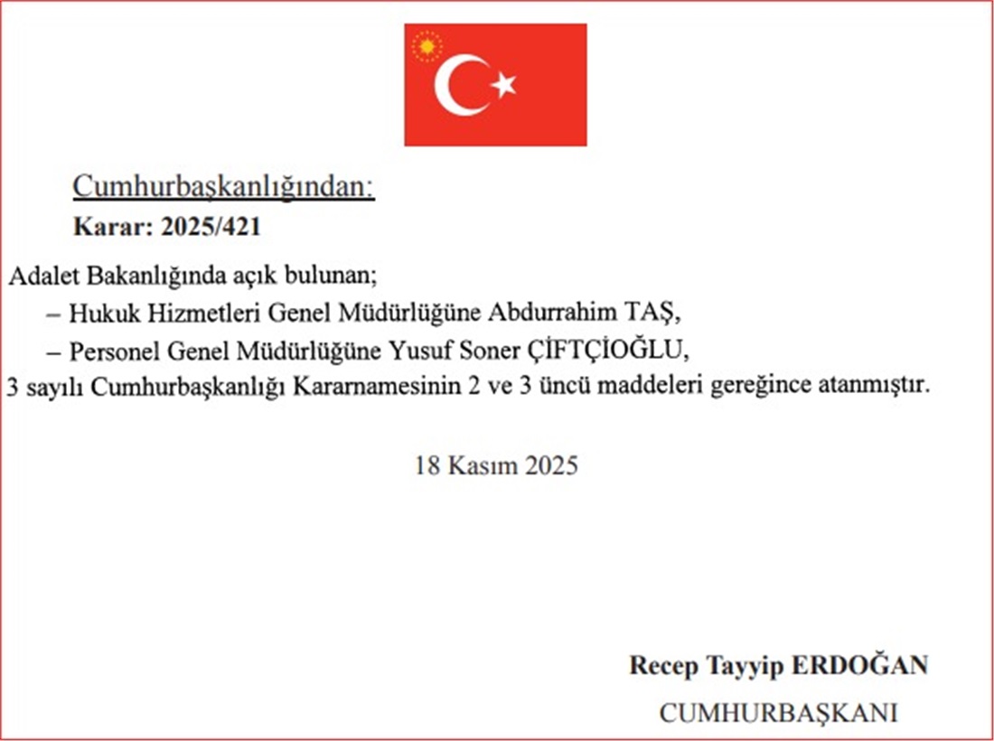 19 Kasım 2025 tarihli Resmi Gazete’de yayımlanan 18 Kasım 2025 tarihli ve 2025/421 sayılı Cumhurbaşkanlığı kararı ile Hukuk Hizmetleri Genel Müdürlüğü’ne atanan Abdurrahim TAŞ, 19 Kasım 2025 tarihinde görevine başlamıştır.